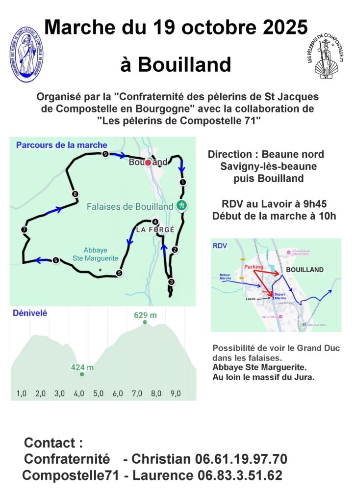Nous ferons au mois d’octobre une marche commune avec COMPOSTELLE 71 à Bouilland organisée par la Confraternité, et au mois de novembre, le retour du pèlerinage avec le prêtre accompagnateur Jérôme RICHON au même lieu que les années précédentes à l’Église de la Visitation de Chevigny St Sauveur.
